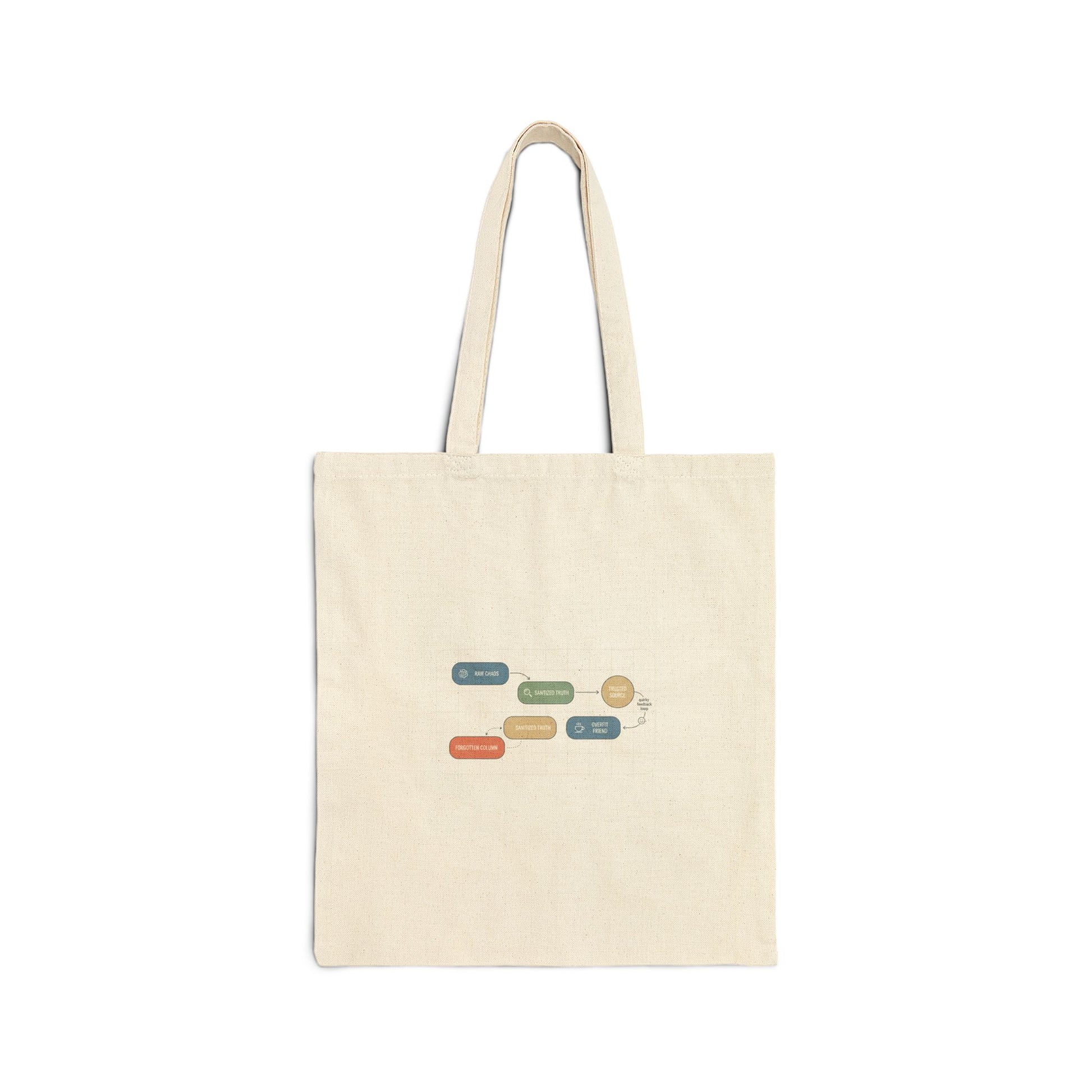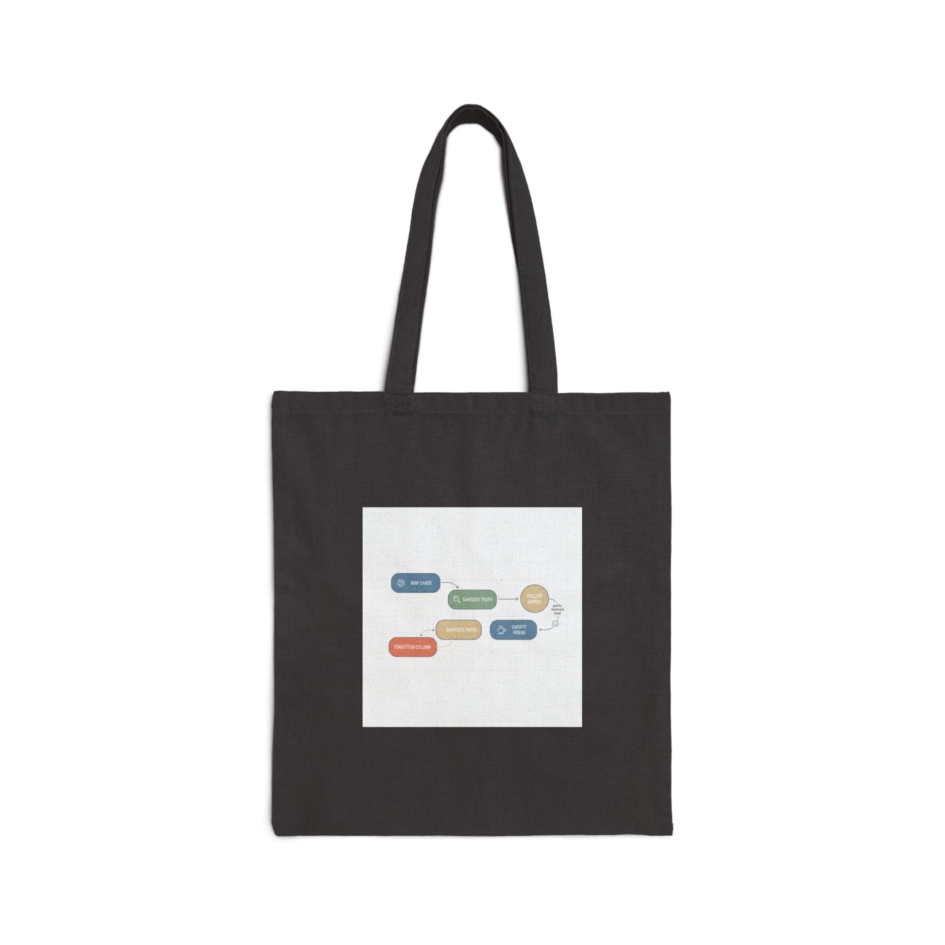 Minimal infographic tote with a dry, nerdy diagram—compact colored nodes connected by thin lines and small sans labels for a tidy data-joke aesthetic. The graphic sits centered on a natural canvas ground, using restrained color accents and clear hierarchy to read like a cheeky chart. Suits students and analytic-minded shoppers who prefer subtle, clever humor in everyday carry.