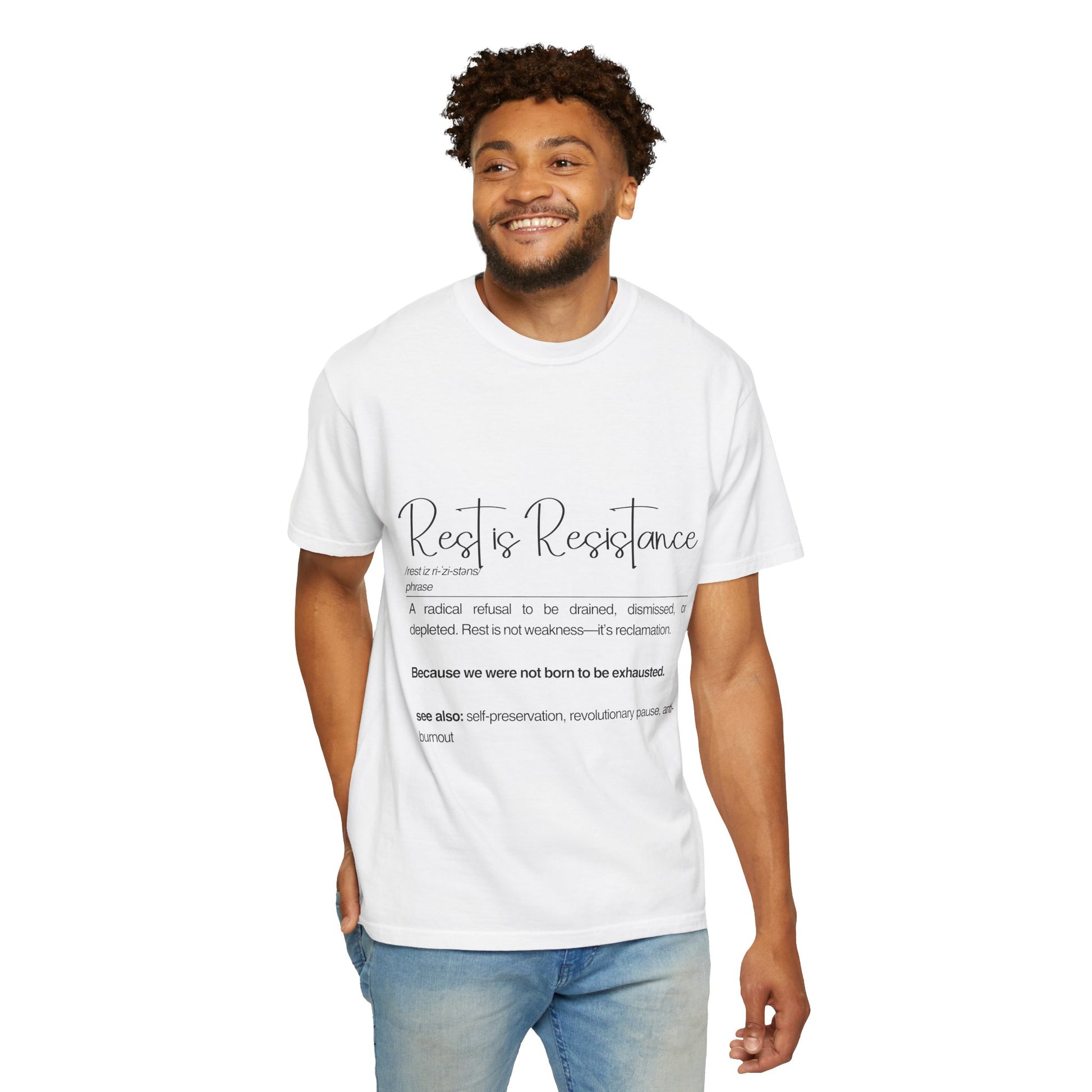 Elevate your casual wardrobe with this versatile Unisex Garment-Dyed T-shirt. Crafted from high-quality, 100% ring-spun US cotton, this tee offers exceptional comfort and durability. The relaxed fit and classic crew neckline make it suitable for a variety of occasions, from a laid-back weekend to semi-formal gatherings. With its uniquely soft garment-dyed fabric, you’ll love the rich textures and colors it brings to your everyday style. Perfect for anyone valuing comfort and fashion, this t-shirt is also a thoughtful gift for friends and family during holidays and celebrations like birthdays, Christmas, or just because. Embrace the ethos of self-care and resistance with this meaningful piece that promotes the idea of taking a break and cherishing restful moments.