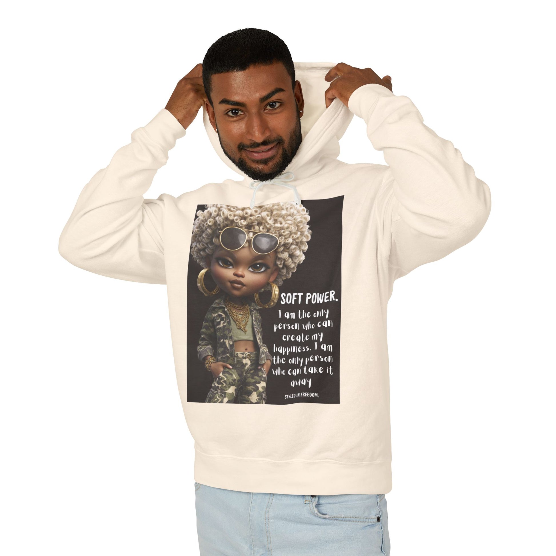 This lightweight hooded sweatshirt carries a cool, confident energy — a soft, breathable cotton hoodie printed with a bold, stylized character that feels both playful and unapologetic. The illustration of a fashionable kid with voluminous curls, oversized hoops, and camo-ready attitude sits front-and-center, turning the hoodie into a wearable statement. The relaxed cut and jersey-lined hood keep movement easy and comfortable while the natural flatcord and clean pigment dyes give a subtly elevated, eco-conscious finish. Wear it on slow mornings, city walks, or when you want to bring a bit of attitude to a laid-back look.