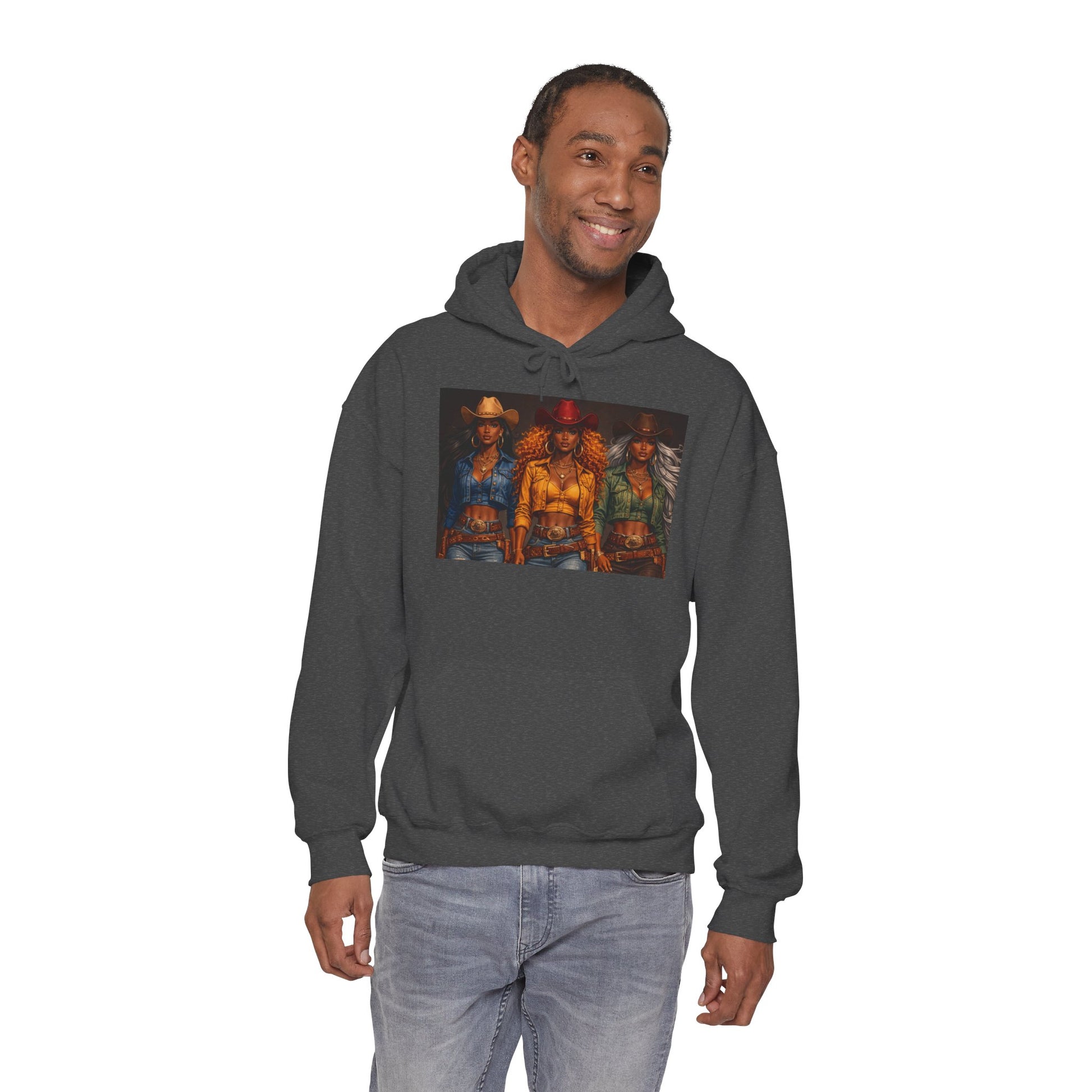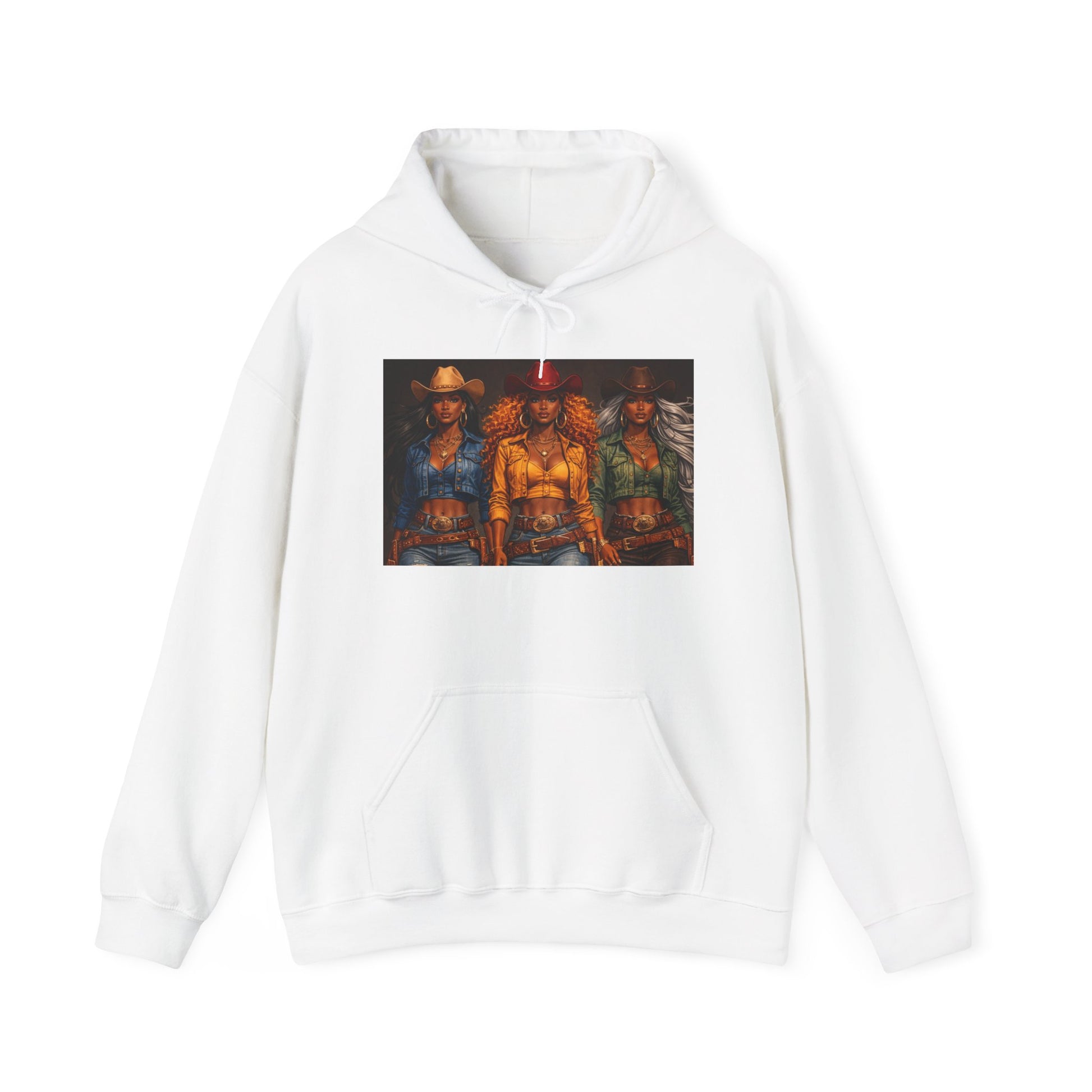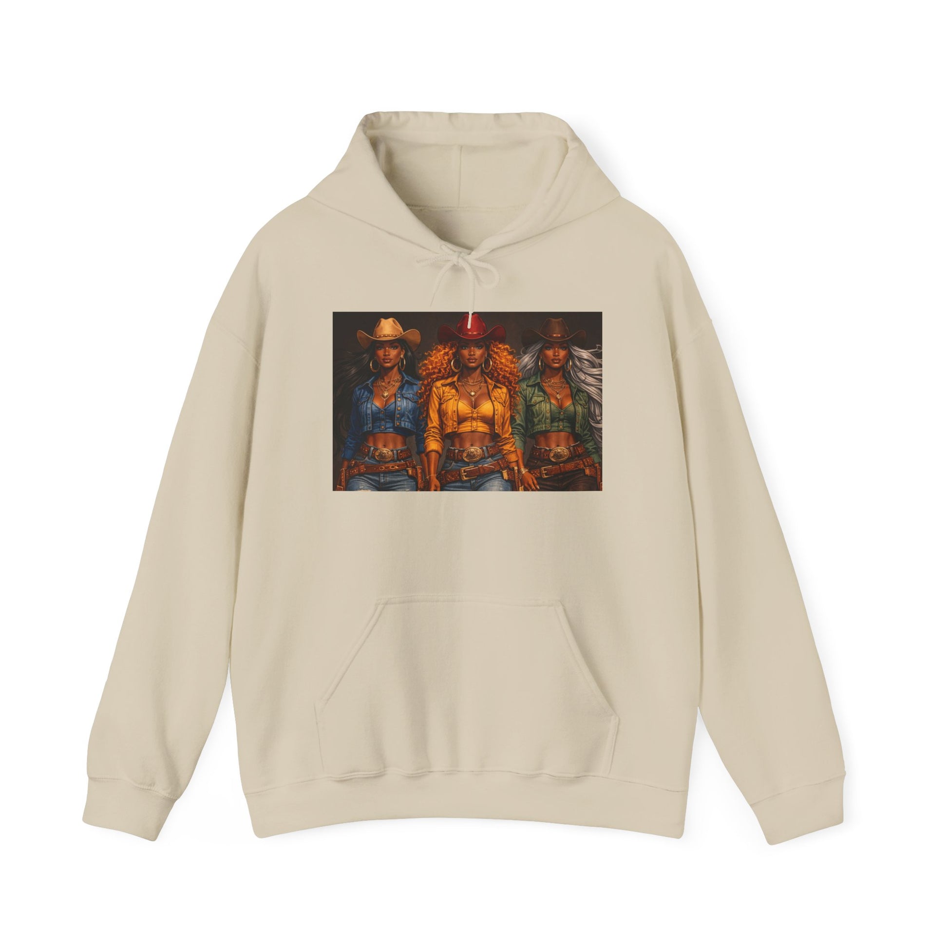 Pull on this warm, lived-in hoodie and step into a story. The soft, medium-heavy cotton/poly blend holds heat without feeling stiff. A bold, cinematic artwork sits across the chest — three figures lit by deep amber and neon accents — giving the hoodie a moody, urban-western energy. The roomy kangaroo pocket keeps hands warm and your essentials close. Double-lined hood and color-matched drawcords add structure and a clean finish. It’s the kind of sweatshirt you reach for when you want comfort with attitude: late-night drives, gallery openings, or weekends holed up writing or sketching. The print options (DTF/DTG and optional embroidery) give the design crisp color and durable wear, so that the image ages with you rather than fades away.