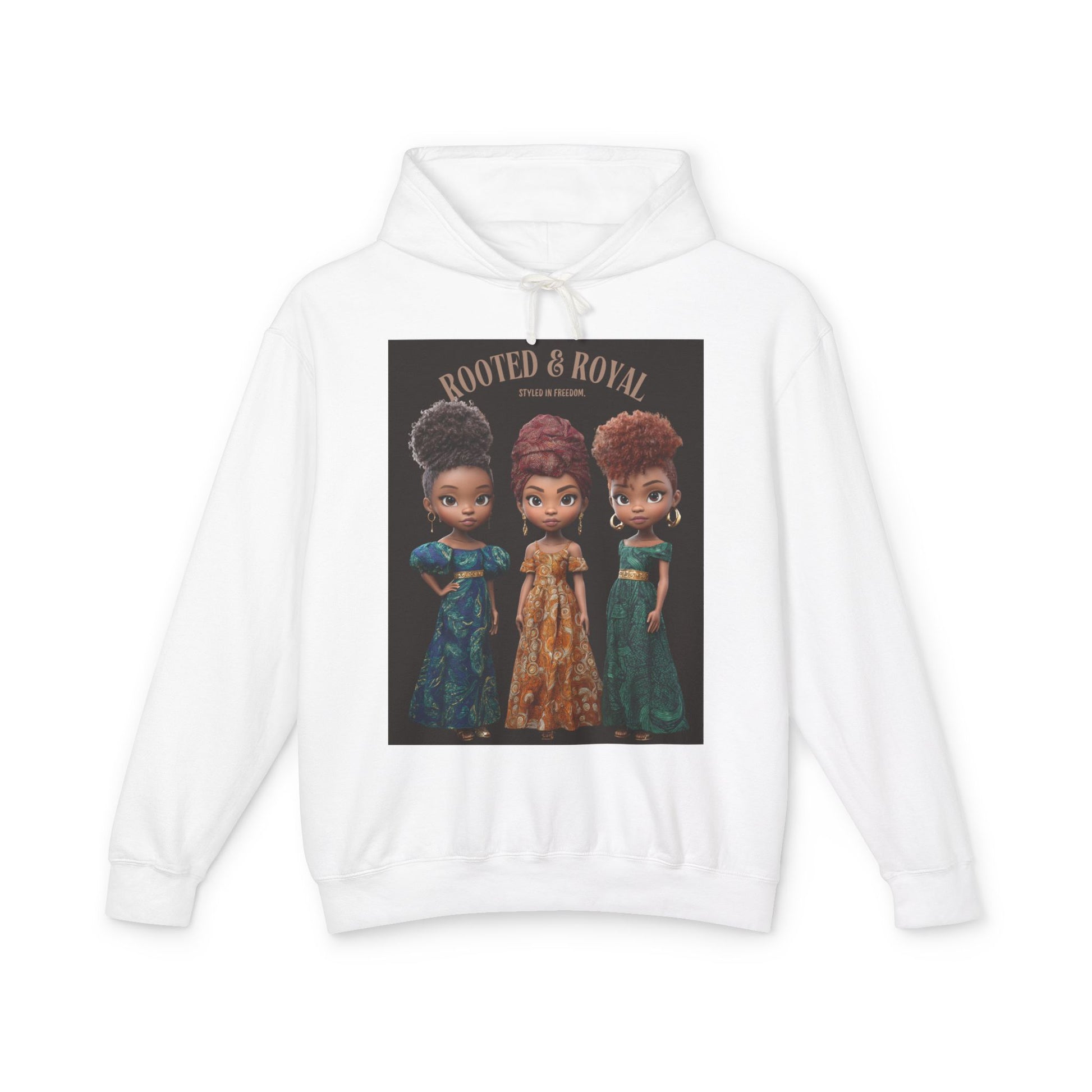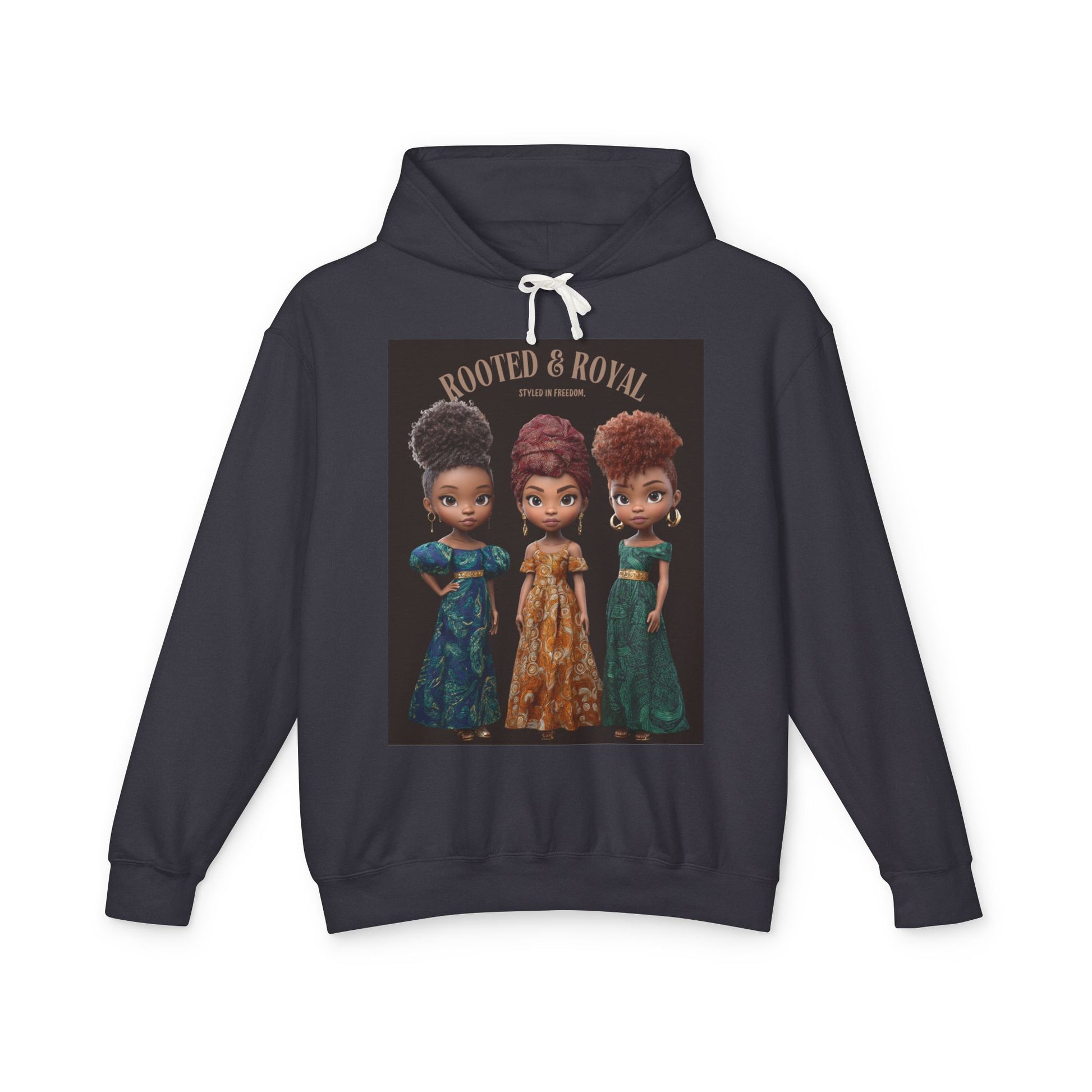 This lightweight hooded sweatshirt carries quiet confidence. Soft, ring-spun cotton drapes easily while the jersey-lined hood and natural flatcord give a considered, wearable finish. The front art features three beautifully styled figures under the words “Rooted & Royal,” a nod to heritage, sisterhood, and self-possession. Wear it on cool mornings, at community events, or layered for an evening out — it moves with you and keeps the focus on what matters: presence and pride.
